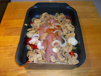 horno y poner en la base pimientos verdes y rojos en tiras. Cuando los tengamos